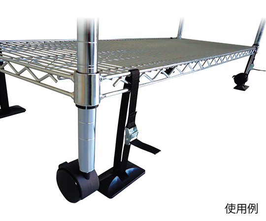 ●足元4ヶ所に耐震マット付きキャッチプレートを貼り、シェルフのワイヤー部分と専用のDCベルトで連結させます。
