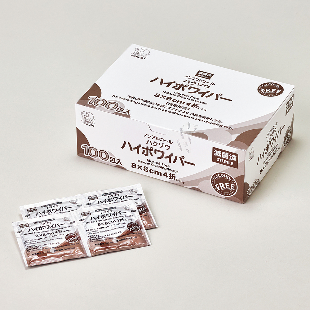 ●8cm×8cmサイズの個包装で滅菌済の清拭綿です。汚れ(ヨウ素など)を落としにご使用いただけます。