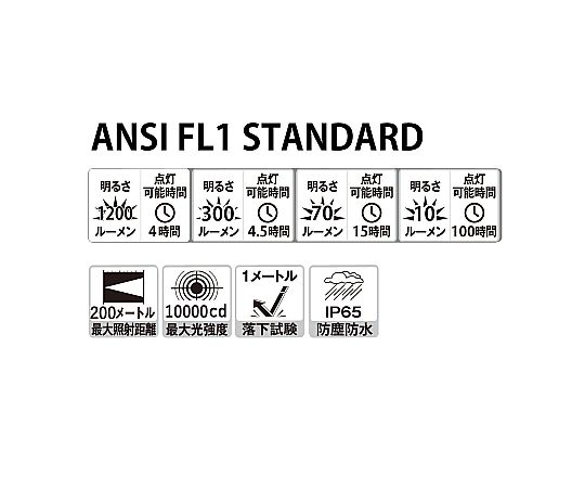 ●明るさ950ルーメン(4時間)300ルーメン(4.5時間)70ルーメン(15時間)10ルーメン(100時間)
