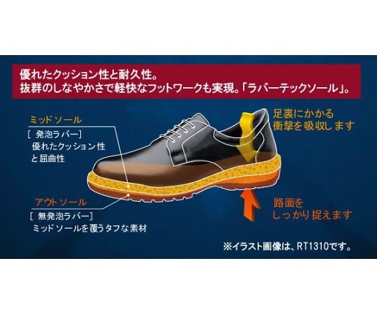 ●通常の紳士靴とは違い、あらゆる現場のプロたちが使用する屈曲性に優れたラバー2層底(ラバーテックソール)。長時間の歩行業務を足元からサポートします。