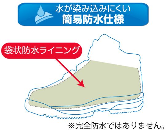 ●靴内部に水が染込みにくくするため防水シートをアッパーに採用しました。本製品は静水4cmに90分浸漬の防水性を基準としておりますが、雨などで長時間着用すると水が浸入する場合があります。また甲上部まで水に浸かると水が浸入します。