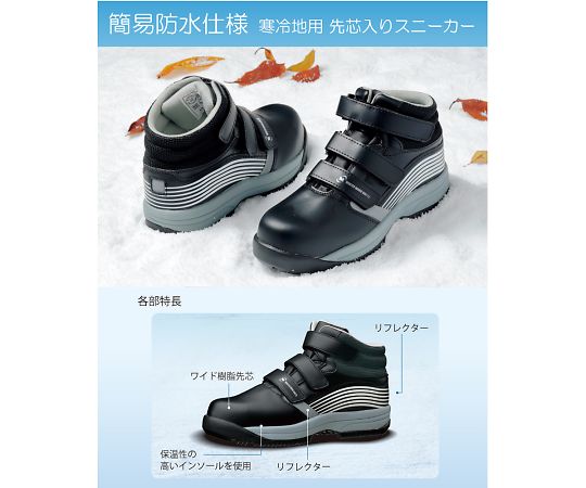 ●足先への圧迫を抑える、幅広の先芯。鋼製先芯と比べ、つま先が冷えにくく、サビず、更に軽量です。JSAA認定A種の安全性能です。