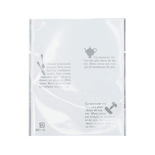 白地の背面にイラストやフランス語のデザインを印刷した、個包装用の平袋。内寸は105×140mmです。