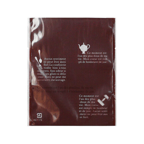 茶色地の背面にイラストやフランス語のデザインを印刷した、個包装用の平袋。内寸は105×140mmです。