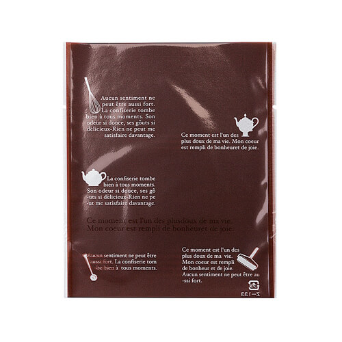 茶色地の背面にイラストやフランス語のデザインを印刷した、個包装用の平袋。内寸は120×160mmです。
