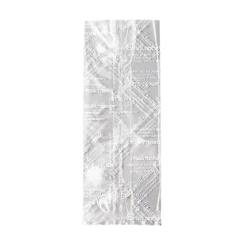 透明フィルムに英字柄を白印刷したガゼット袋。内寸は75×60×190mmです。