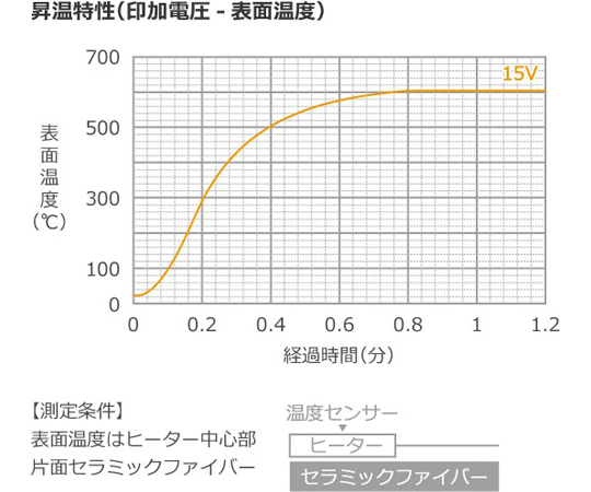 ●▼アルミナ基板の耐熱衝撃性(急激な温度変化にどこまで耐えられるか)は約200℃です。ヒーター表面に、急激かつ大きな温度差が生じないよう、ご注意ください。