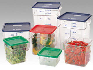 CAmBROキャンブロ フードコンテナー。※アメリカ。※NSF※洗浄機対応。丸型のものに比べて、収納スペースが33%も増えました。本体が透明なので、一目で中身が分かります。丈夫なポリカーボネイト製で、耐久性に優れています。本体の外側に目盛りが付いているので、中身の量がすぐ分かります。カバーにはタブが付き、開けやすくなっています。カバーの色と目盛の色がマッチします。※蓋は