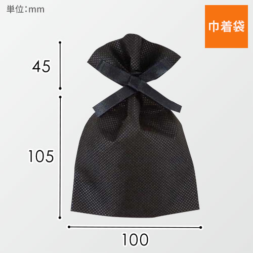 サイズは幅100×高さ150(絞り口まで105)mmで両面不織布製のシンプルな巾着袋。