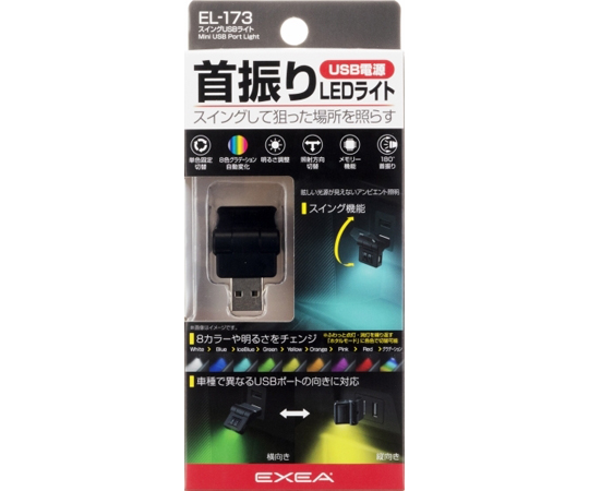 ●点灯LEDを切替えると照射方向を変更できるので、車種や機器によって異なるUSBポートの向き(横・縦)に対応できます。