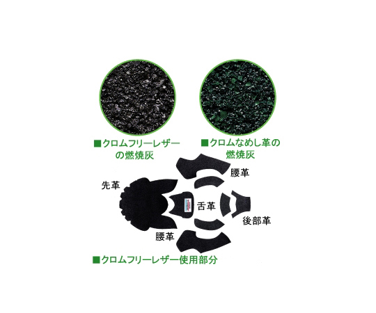 ●エコレザーとは重金属、ホルムアルデヒド、発癌性塗料など革に関する有害物質などの基準値を満たし環境への影響が少ないと認められた革材料です。ミドリ安全が開発した「クロムフリーレザー」は、植物から抽出したタンニンを主成分とするなめし剤を使用しているため、燃やしても有害な6価クロムを発生しません。甲被はもちろん、すべての部品に焼却しても安心な材料を使用しているため、安全に焼却処理や熱エネルギー回収が行えます。