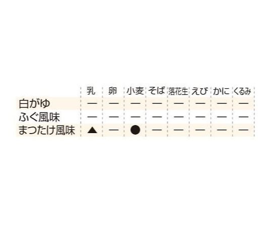 ●▼乳:-、卵:-、小麦:-、そば:-、落花生:-、えび:-、かに:-、くるみ:-。(特定原材料に準ずるもの)/ア-モンド:-、あわび:-、いか:-、いくら:-、オレンジ:-、カシューナッツ:-、キウイフルーツ:-、牛肉:-、ごま:-、さけ:-、さば:-、大豆:-、鶏肉:-、バナナ:-、豚肉:-、まつたけ:-、もも:-、やまいも:-、りんご:-、ゼラチン:-。
