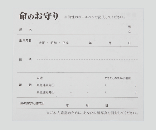 ●医療情報カード項目:名前・性別・生年月日・現住所・電話番号・緊急連絡先・血液型・アレルギーの有無・持病・かかりつけ医療機関名・過去の大きな病歴・入院歴/手術歴・服用しているお薬