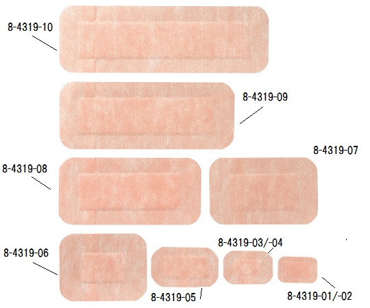 ●材質:テープ/PU(ポリウレタン)フィルム・ポリエステル不織布、パッド/脱脂綿・PE(ポリエチレン)ネット、粘着剤/アクリル系