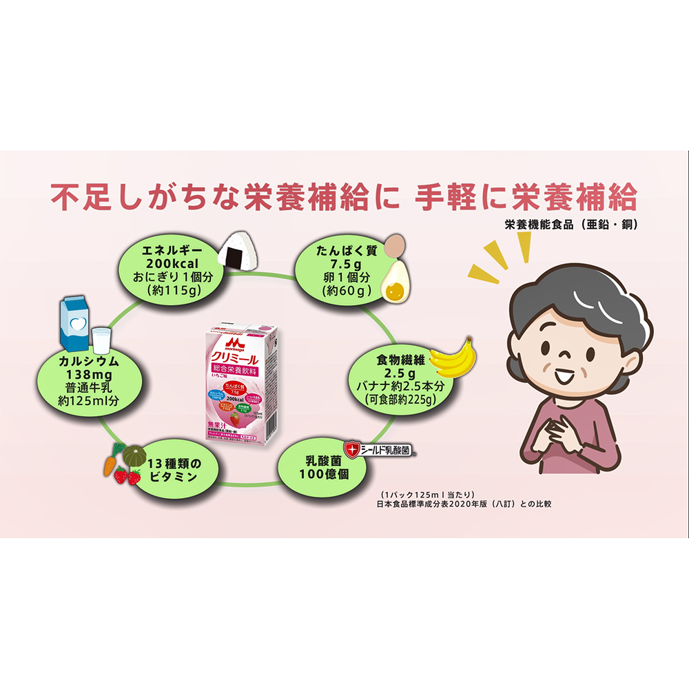 ●主な栄養成分(1本125mlあたり):エネルギー200kcal、たんぱく質7.5g、脂質6.7g、糖質26.8g、食物繊維2.5g、カルシウム138mg、鉄1.5mg、亜鉛1.4mg、銅0.14mg、ビタミンD2.4μg