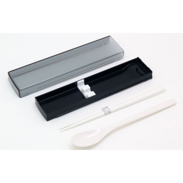 お箸とスプーンのケース入りセットです。シリコーンパーツ付きでカチャカチャ音がなりません。18cmの箸・スプーン付き。食器洗浄機・乾燥機OK。抗菌剤入り(本体・箸・スプーン)。日本製。サイズ:48×191×18mm/材質:[本体・スプーン]ABS樹脂、[フタ]AS、[箸]PMMA/重量:86g48×191×18mm