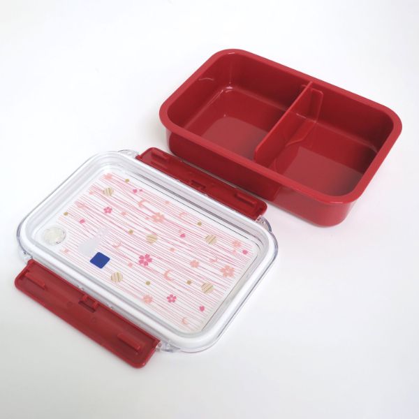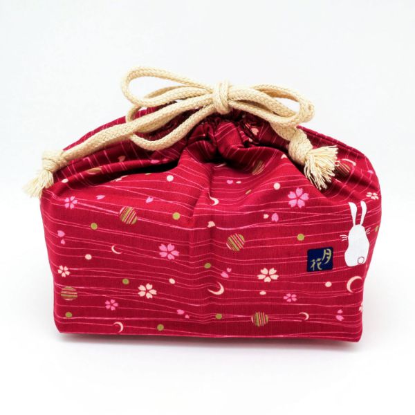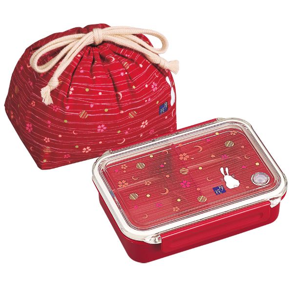 月と花とうさぎがデザインされた和柄のランチシリーズ。弁当箱と巾着袋のセットです。フタを外して電子レンジOK。食器洗浄機・乾燥機OK。仕切付き。防汚剤添加。日本製。サイズ:[弁当箱サイズ]161×124×H49mm、[巾着サイズ]270×160mm/(底)160×120mm/材質:[本体]PP、[フタ]AS、[止め具]ABS、[仕切]PP、[巾着]綿/重量:199g/容量:500ml