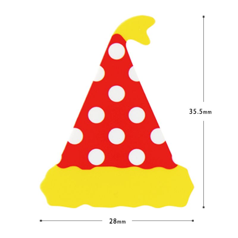 動物ケーキや、キャラクターケーキに使いたいケーキピックです。パーティーハットが、ケーキを楽しく彩りショーケースをにぎやかにしてくれます。カラフルな帽子でお誕生日やお祝いのケーキをパーティームードに!片面デザイン。食品対応。サイズ:W28×H35.5mm材質:PP35.5×28mm
