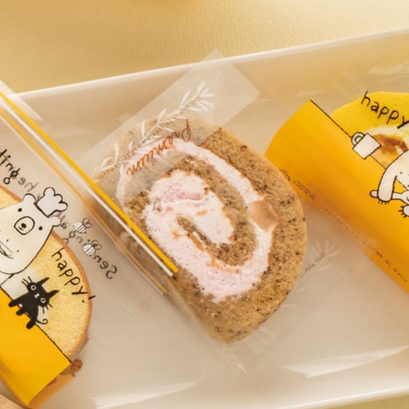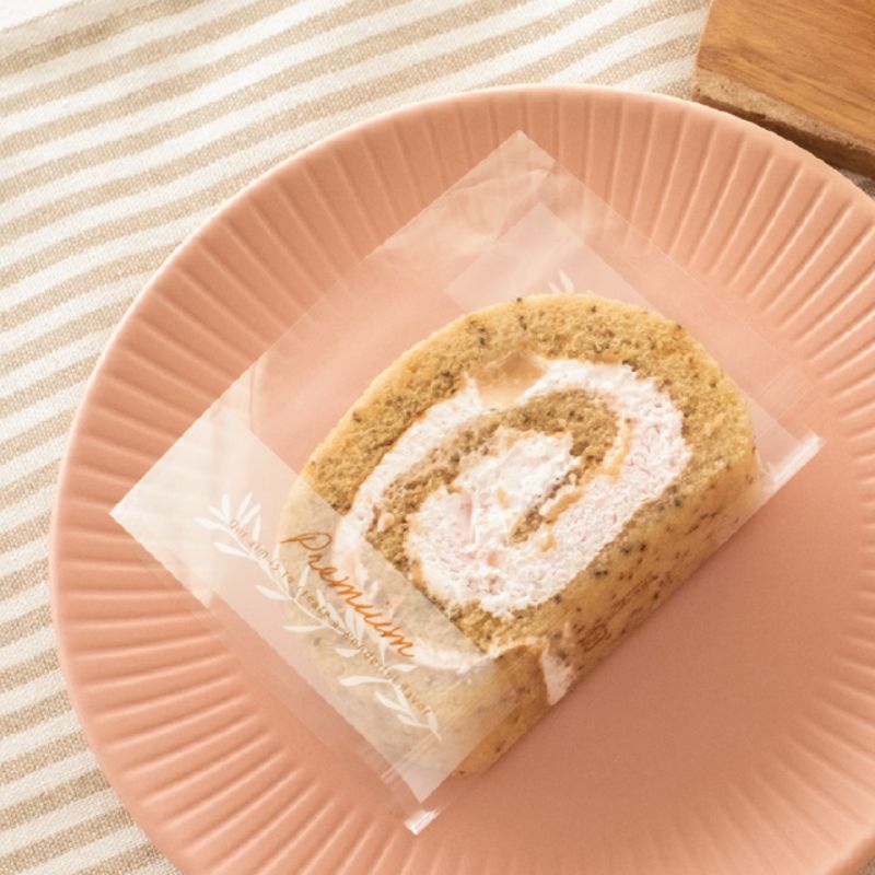 シンプルで上品なデザインがカットロールケーキをより美味しそうに魅せてくれるフィルムです。フィルム中央の識別マークを中心にカットロールケーキを置くと位置が合わせやすくキレイに巻くことができます。食品対応。片面デザイン。サイズ:W100×H180mm、[厚み]0.025mm材質:OPP(透明)180×100mm