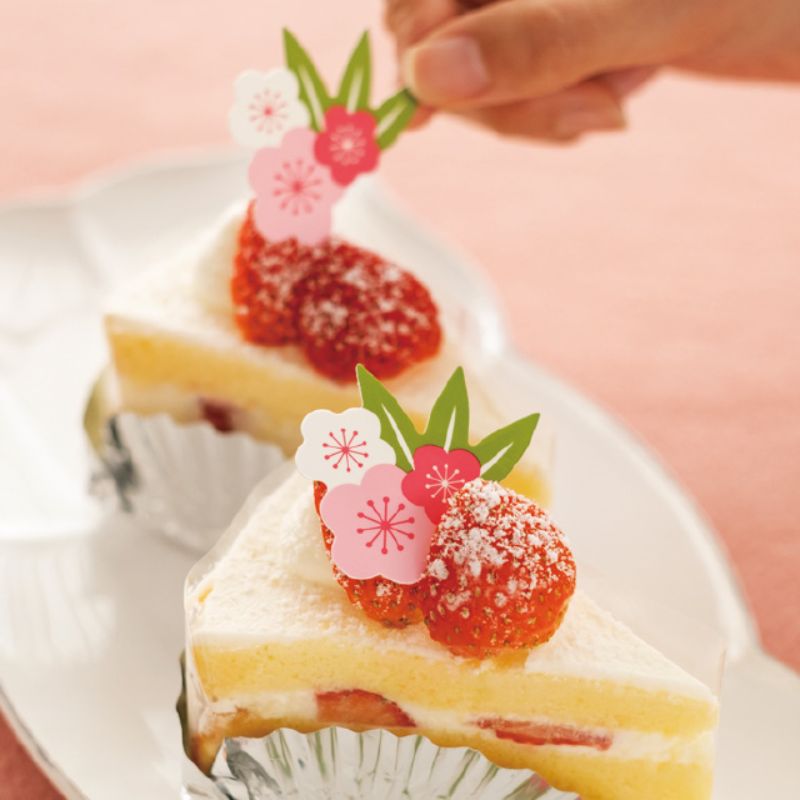 花飾りのケーキピックです。お正月やひなまつりなどのシーズンにおすすめです。いつものケーキにワンポイントとして添えるだけで、華やかさをプラスします。片面デザイン。食品対応。サイズ:W50×H35mm材質:PP50×35mm