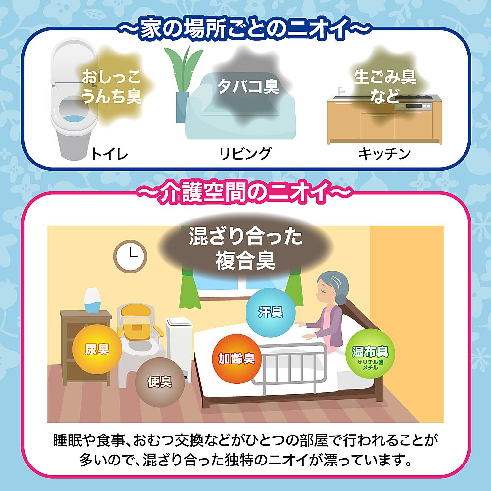 ●尿もれなどによる放置が原因で、しみついた尿臭や体臭をしっかり消臭します。