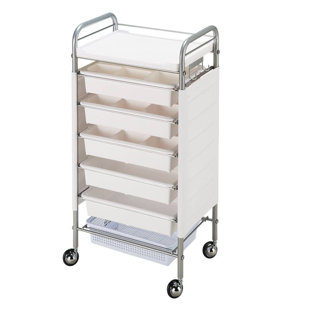 ●引き出し式トレー5段と固定式カゴ1段付きの、収納力に優れたワゴンです。