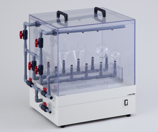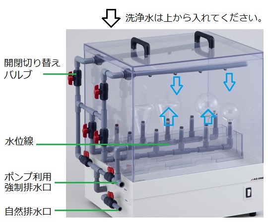 ●循環水を上・下部から噴霧し、ガラス器具の内部・外部を洗浄します。