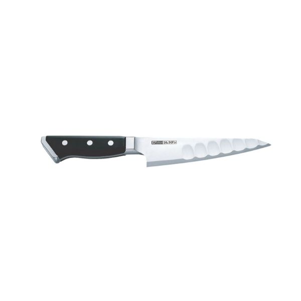 へこみの部分に空気が入ることにより、刃離れの良さと、軽い切れ味を実現しました。切断時に側面にかかる密着抵抗を最小にしてあります。庖丁側面に密着しにくいので作業性が良く、切れ味が良く、しかも刃研ぎの面積がせまいため、非常に研ぎ易い設計です。サイズ:[刃渡り]150mm材質:グレステン鋼150mm