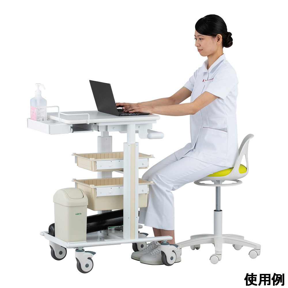 ●材質:天板/メラミン化粧合板、支柱/アルミ、フレーム/スチール(焼付塗装)、ハンドル/スチール(焼付塗装)・POM、キャスター/エラストマー、トレー/ABS樹脂、ゴミ箱/PP(ポリプロピレン)