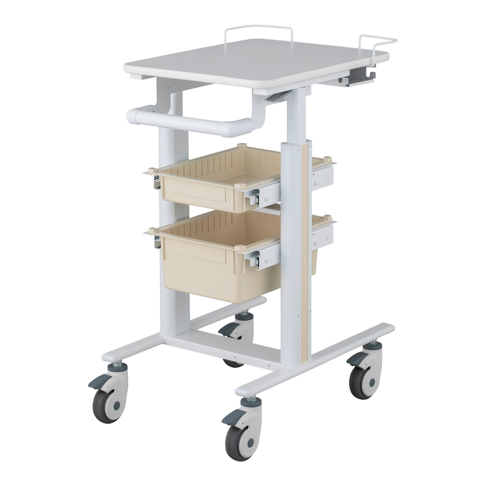 ●材質:天板/メラミン化粧合板、支柱/アルミ、フレーム/スチール(焼付塗装)、ハンドル/スチール(焼付塗装)・POM、キャスター/エラストマー、トレー/ABS樹脂、ゴミ箱/PP(ポリプロピレン)