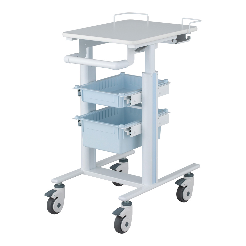 ●材質:天板/メラミン化粧合板、支柱/アルミ、フレーム/スチール(焼付塗装)、ハンドル/スチール(焼付塗装)・POM、キャスター/エラストマー、トレー/ABS樹脂、ゴミ箱/PP(ポリプロピレン)