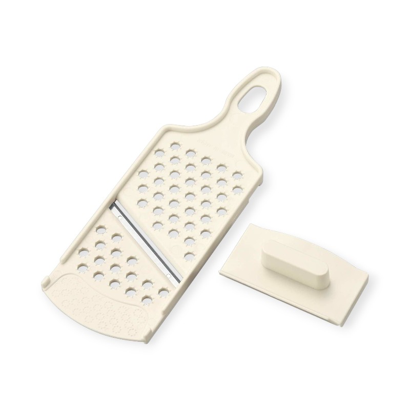 大根や山芋などのおろしに!キュウリや玉ねぎのスライスやキャベツの千切りに!しょうがや生わさびなどの薬味おろしに!小さくなった野菜もホルダー付で扱いやすい!材質:ポリスチレン品番:062150
