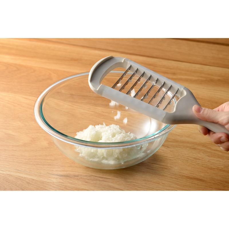 史上初のステンレス鬼刃。折れたり欠けたりせず、カビないので衛生的!水分が出ず、栄養たっぷり!シャキシャキ食感でおいしさアップ!食器洗浄機で洗えるのでお手入れ簡単!パルメザンチーズもおろせる!材質:[本体]ポリプロピレン、[ハンドル]エラストマー、[刃]ステンレス品番:062096