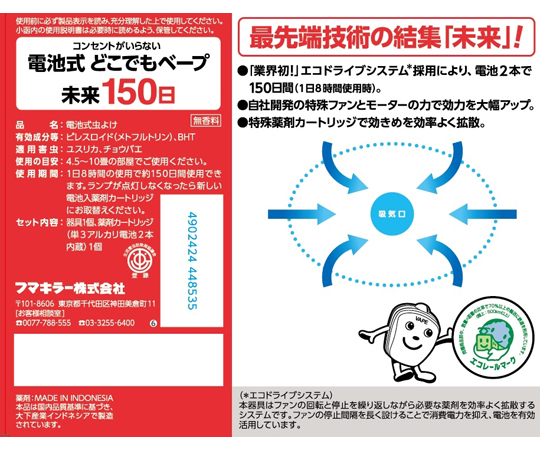 ●特殊カートリッジと自社開発の特殊ファン、モーターの力で3倍の効力を実現。(初代どこでもベープNo.1比較)
