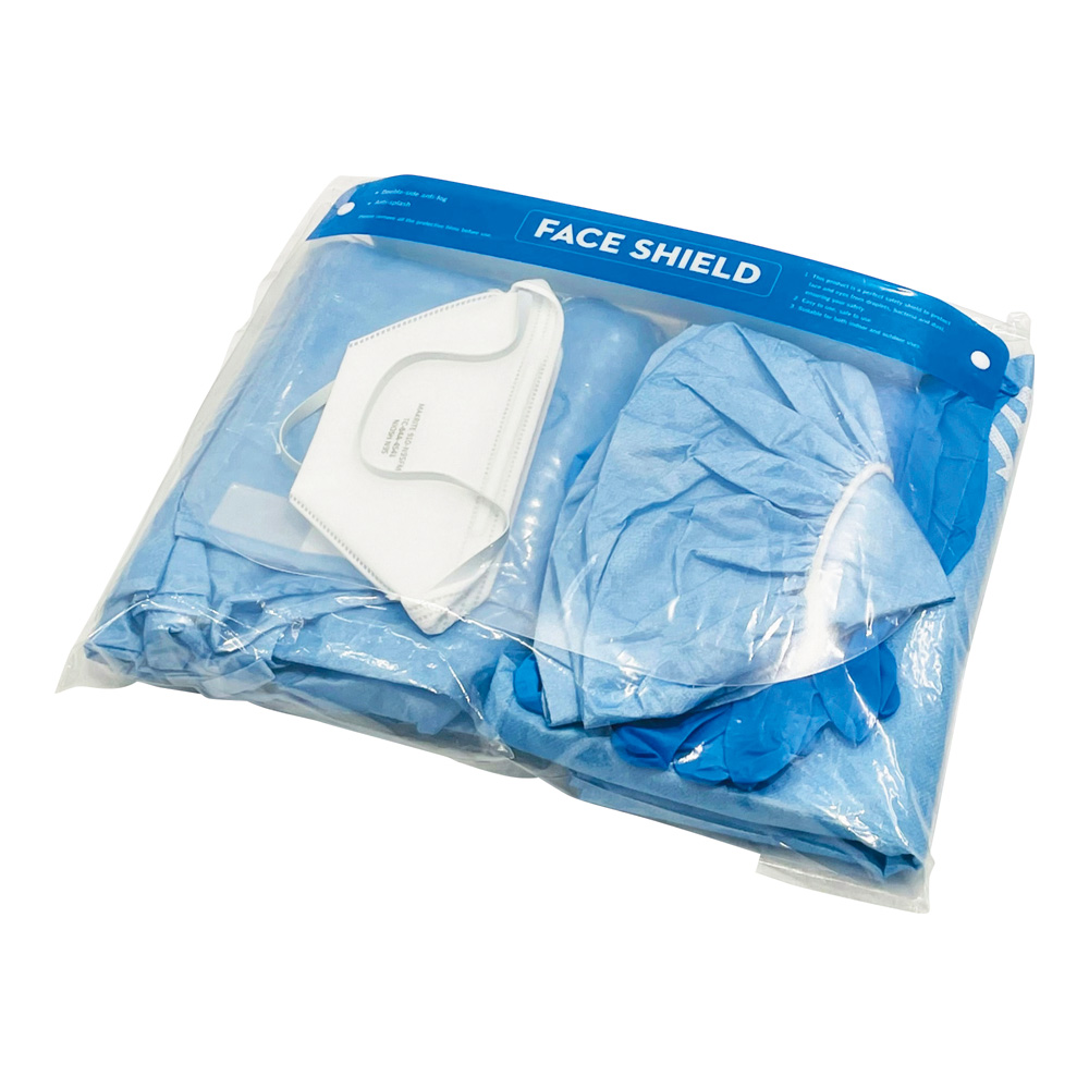 ●セット内容:ガウン×1枚、キャップ×1枚、ブーツカバー×1足、手袋×4枚、フェイスシールド×1個、N95マスク×1個