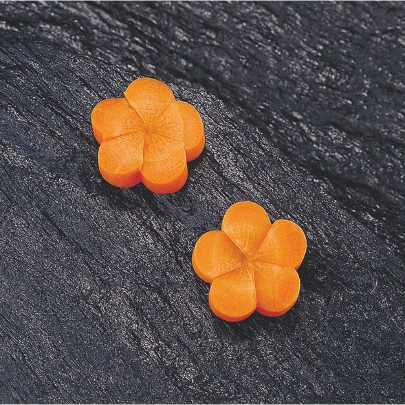 「厚口野菜抜き梅」で抜いた物を入れ、片手で廻すと簡単に立体的な野菜抜きが出来上がります。厚み23mm位にすれば梅が2ケできます。にんじんの仕上がりサイズは約14mmになっています。[品番]397003。材質:18-0ステンレス