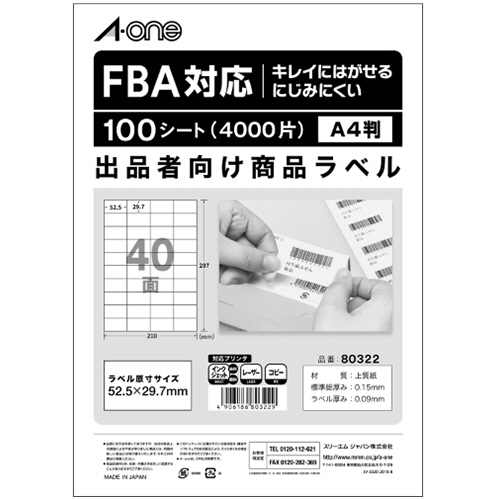 ●FBAに対応したラベルです。キレイにはがせるタイプ。A4・マット紙、40面(52.5×29.7mm)・100シートです。