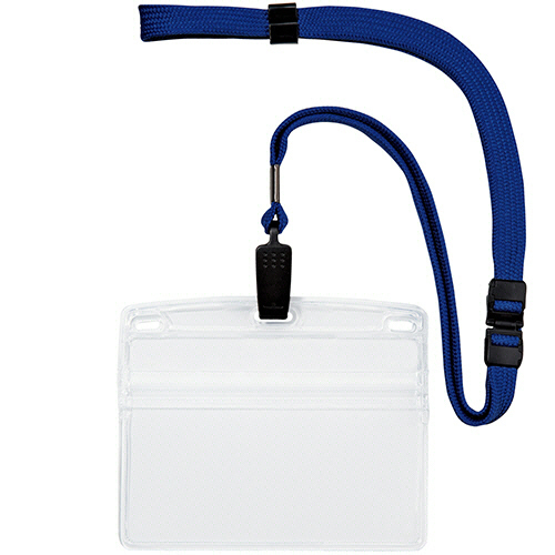 ●クリップ式の吊り下げ名札。ケースはソフトタイプ・ヨコ特大サイズ、ひもの色は青です。