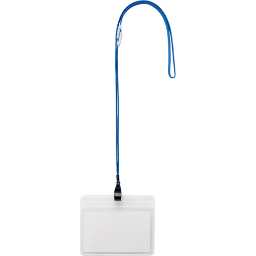 ●大きめの防水チャック付吊り下げ名札。ストラップ色は青です。