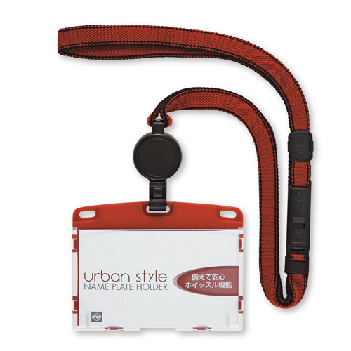 IDカードの使用に便利なリール式。防災・防犯に備えるホイッスルが標準装備。