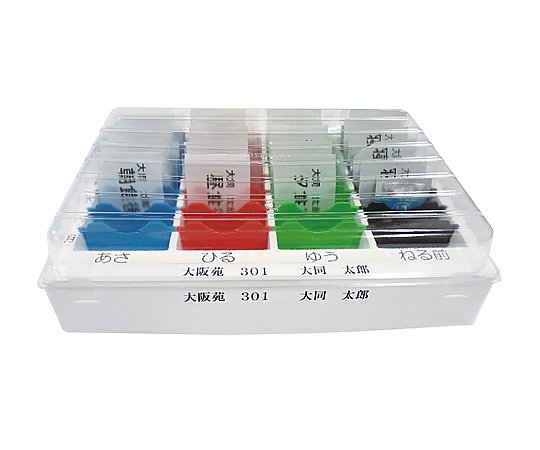 ●セット内容:トレー×1個、フタ×1個、仕切板(青・赤・緑・黒)×各6枚、シール(用法・曜日・名前)×1枚