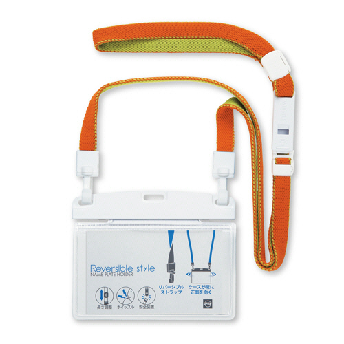 ●カジュアルな色合いで、お洒落をコーディネート。ソフトタイプ・ヨコ名刺サイズ、ストラップの色は橙/草の吊り下げ名札です。