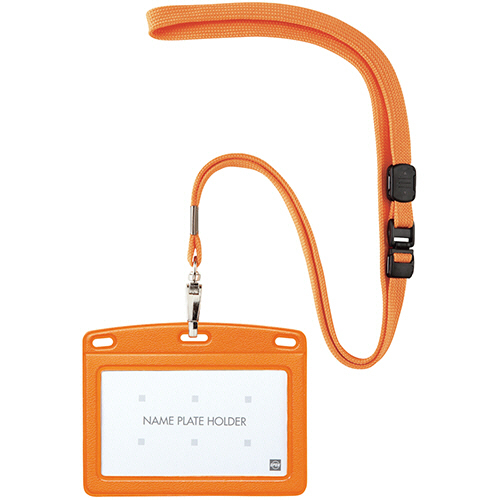 ●ヨコ名刺サイズのレザー調吊り下げ名札、色は橙です。10個セット。