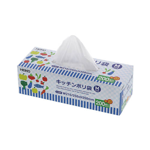 1枚ずつ取り出せるポップアップ式のボックス型ポリ袋です。
