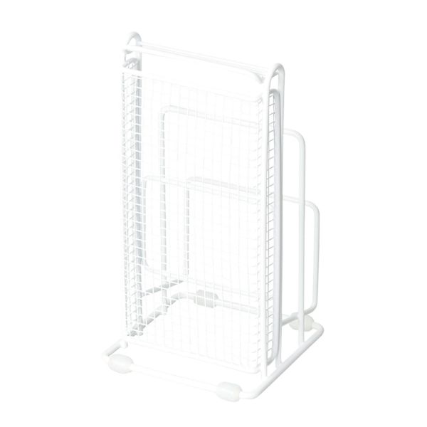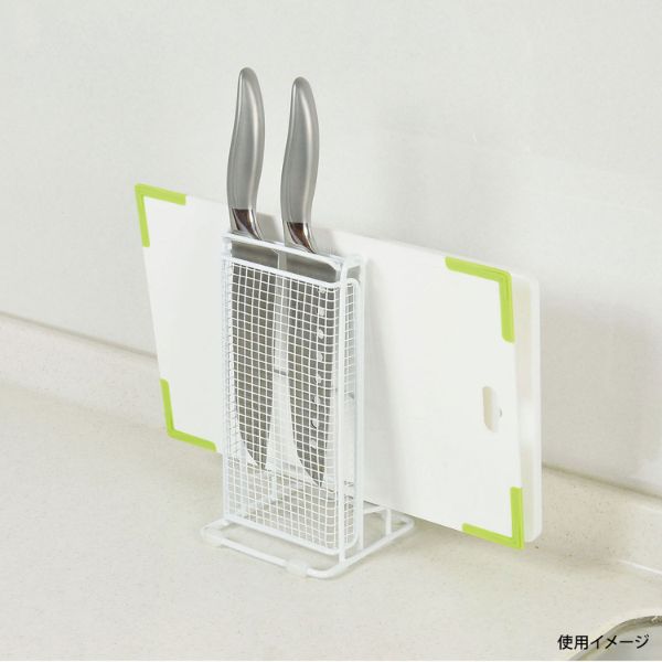 厚さ約15mm以下のまな板2枚と、柄元から先端までの長さが約180mm以内の包丁が2本一緒に収納できる。サイズ:(約)幅12×奥行11.5×高さ22.5cm材質:本体鉄(エポキシ樹脂塗装)、すべり止めシリコーンゴム(約)幅12×奥行11.5×高さ22.5cm
