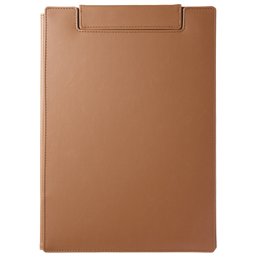 ●カバー付、キャメルのクリップボード。書類や名刺が収容できるポケット付。