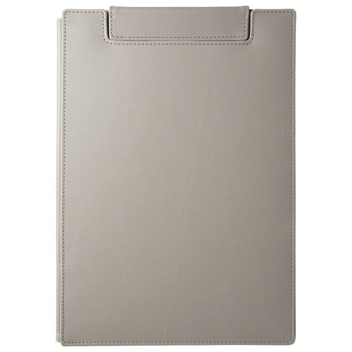 ●カバー付、グレーのクリップボード。書類や名刺が収容できるポケット付。