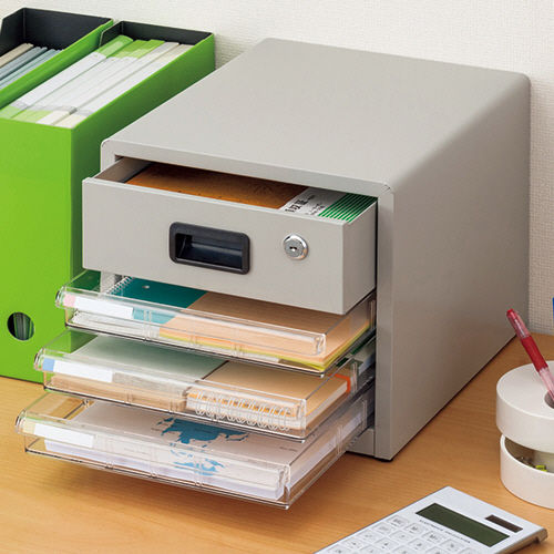 中身が見えるクリアな引き出し。カギ付きなので安心です。