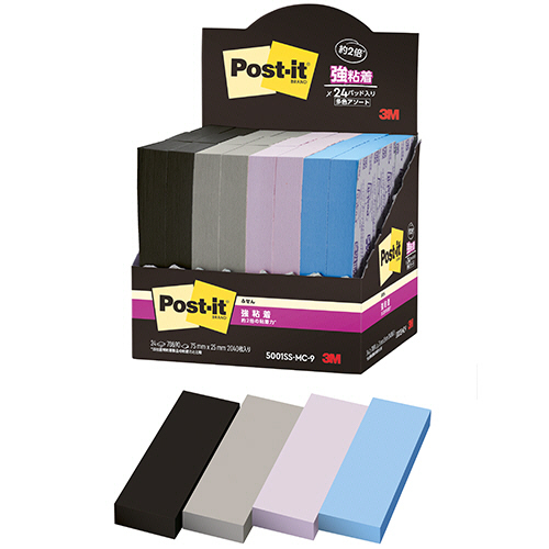 ●75×25mmの強粘着ふせん。90枚×18冊+70枚×6冊(ブラックのみ)パック。