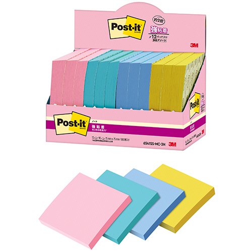 ●75×75mmのノートサイズ・強粘着ふせん。90枚×12冊パック。